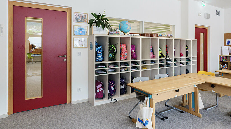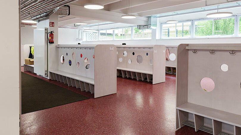 Die Garderoben im Eingangsbereich sind neu, hell gestaltet und bieten ausreichend Platz für alle Schüler*innen. Die klare Beschilderung erleichtert die Orientierung und die freundliche Farbgestaltung trägt zu einer angenehmen Atmosphäre bei.