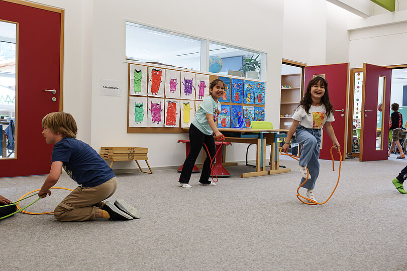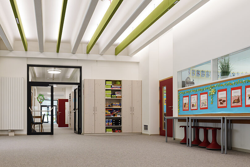Die neuen elektronischen Tafeln und Bildschirme ermöglichen einen zeitgemäßen, modernen Unterricht. Nichtsdestotrotz hat auch die analoge Klassentafel an unserer Schule weiterhin im Unterricht einen großen Stellenwert. Unsere Gänge sind jetzt nicht mehr nur Wege von A nach B, sondern erweiterte Lernbereiche. Durch die Fenster in den Klassenzimmern können wir Lehrpersonen die Kinder gut im Blick behalten, auch wenn sie im Gang arbeiten. Das schafft Flexibilität und fördert die Selbstständigkeit. Gleichzeitig sind die Gänge wichtige Treffpunkte für alle: für einen kurzen Austausch unter uns Lehrpersonen oder für die Kinder in den Pausen. Sie beleben das Miteinander und stärken das Gemeinschaftsgefühl in unserem „Haus des Lebens und Lernens".