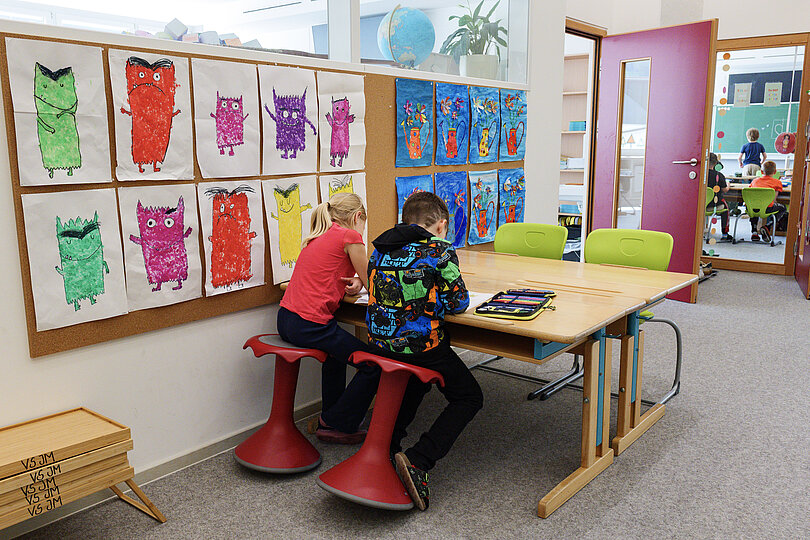 Durch den Umbau kam es zur Neuaufteilung von mehreren Räumen und es wurde sehr viel mit Glas und offenen Möbeln gearbeitet. Die Klassenräume sind nun wesentlich geräumiger und die Kinder können sich durch die angepasste Beleuchtung besser konzentrieren. Durch die neuen räumlichen Gegebenheiten haben wir mehr Möglichkeiten, unser Konzept von offenen Unterrichtsphasen qualitativer umzusetzen. Unsere Schüler*innen arbeiten meist in offenen Phasen und bevorzugen dabei vor allem das Arbeiten in unseren Gängen. Wir haben unterschiedliche Arbeitsutensilien, aus denen die Kinder wählen können, sei es aus Bodentischen oder Dreiecks- und Gruppentischen sowie auch unterschiedlichen Sitzmöglichkeiten.